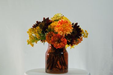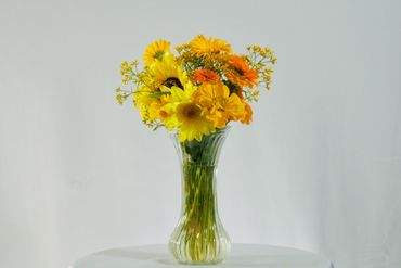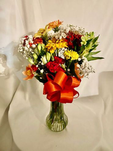 Vibrant bouquet of orange, red, and yellow flowers in a clear glass vase.
