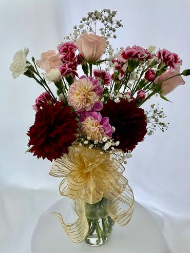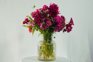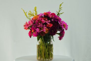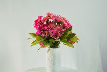 A vibrant bouquet of pink and white flowers in a glass jar.