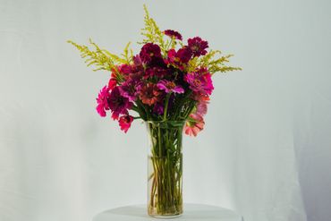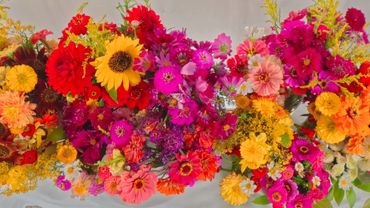 A vibrant bouquet of mixed colorful flowers including sunflowers and pink blossoms.